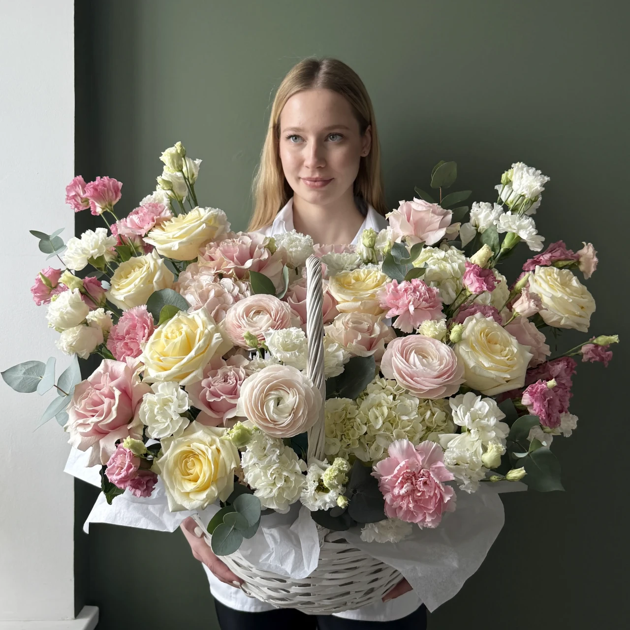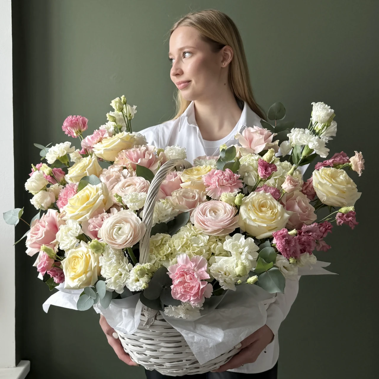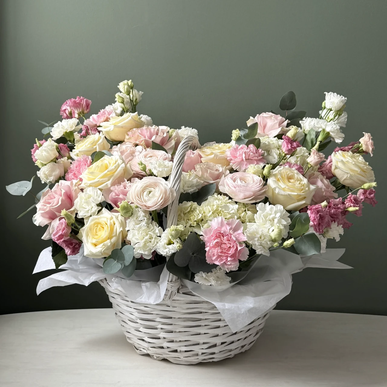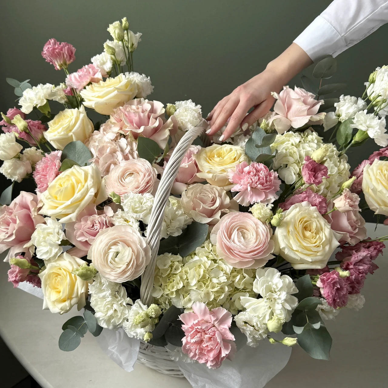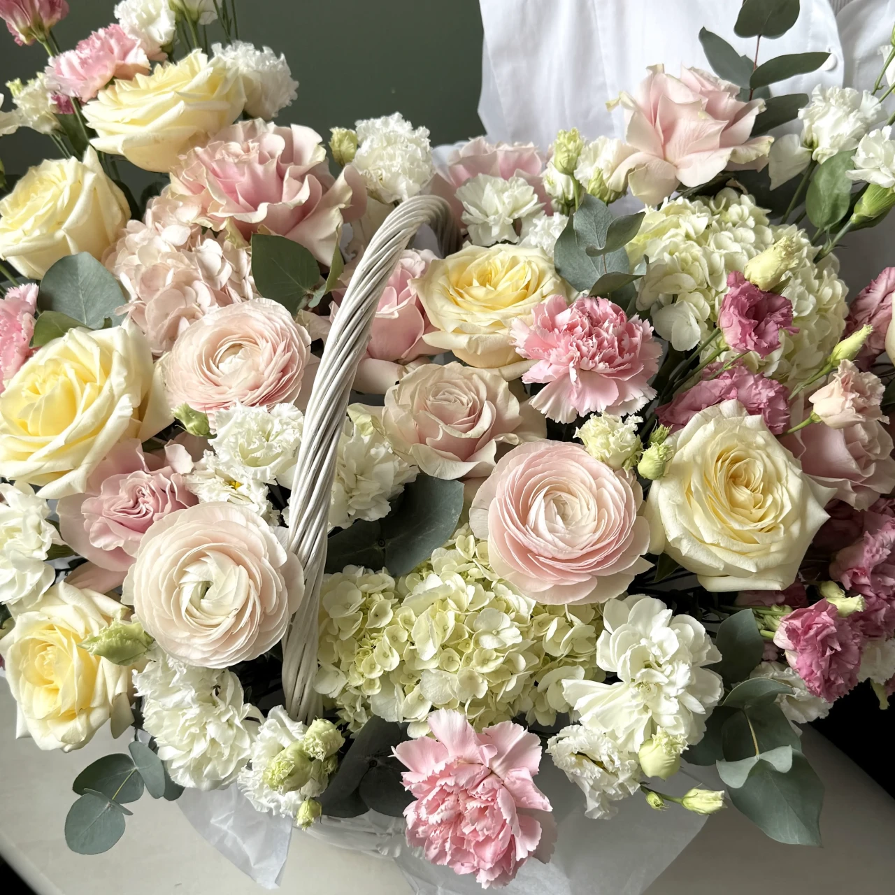 Корзина ранункулюсы, розы и диантусы